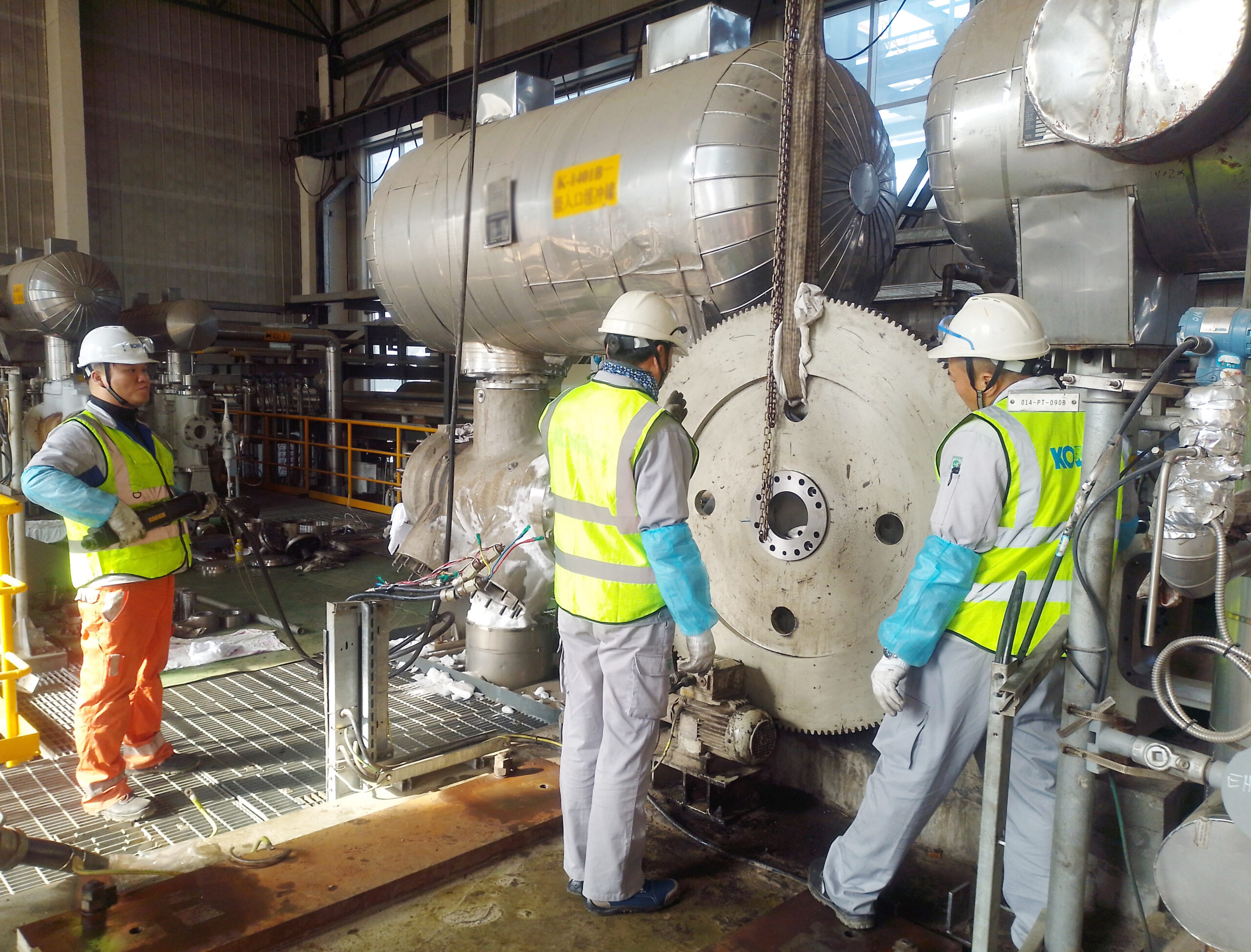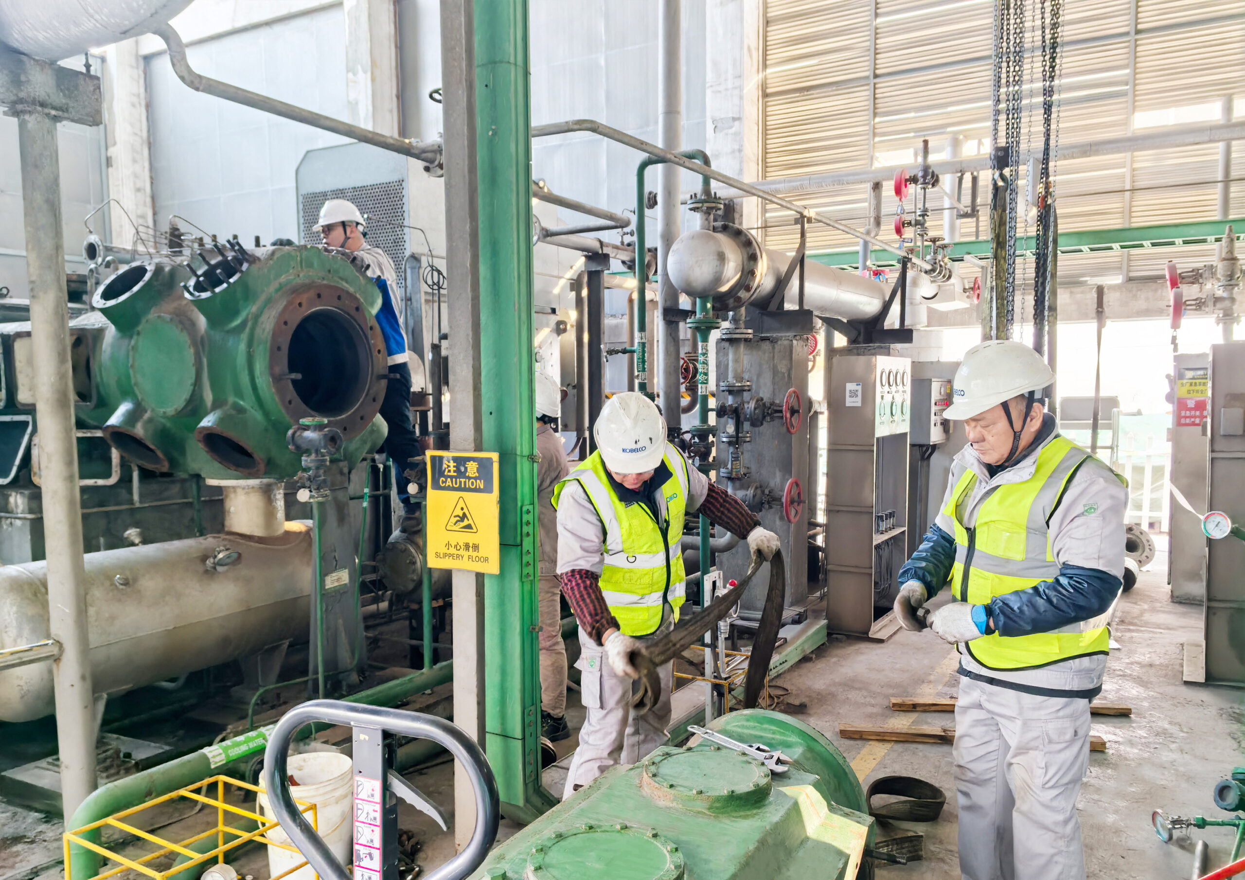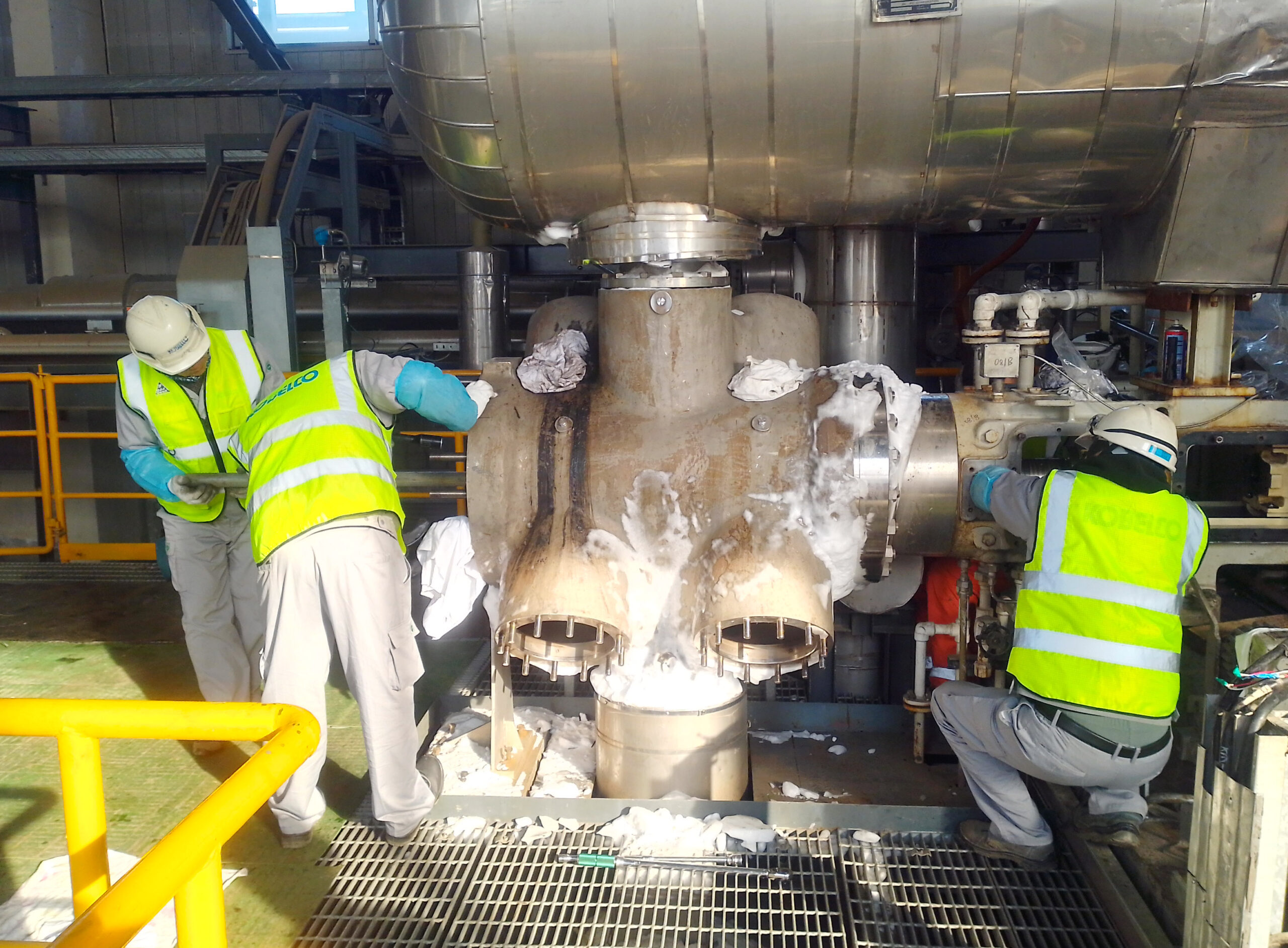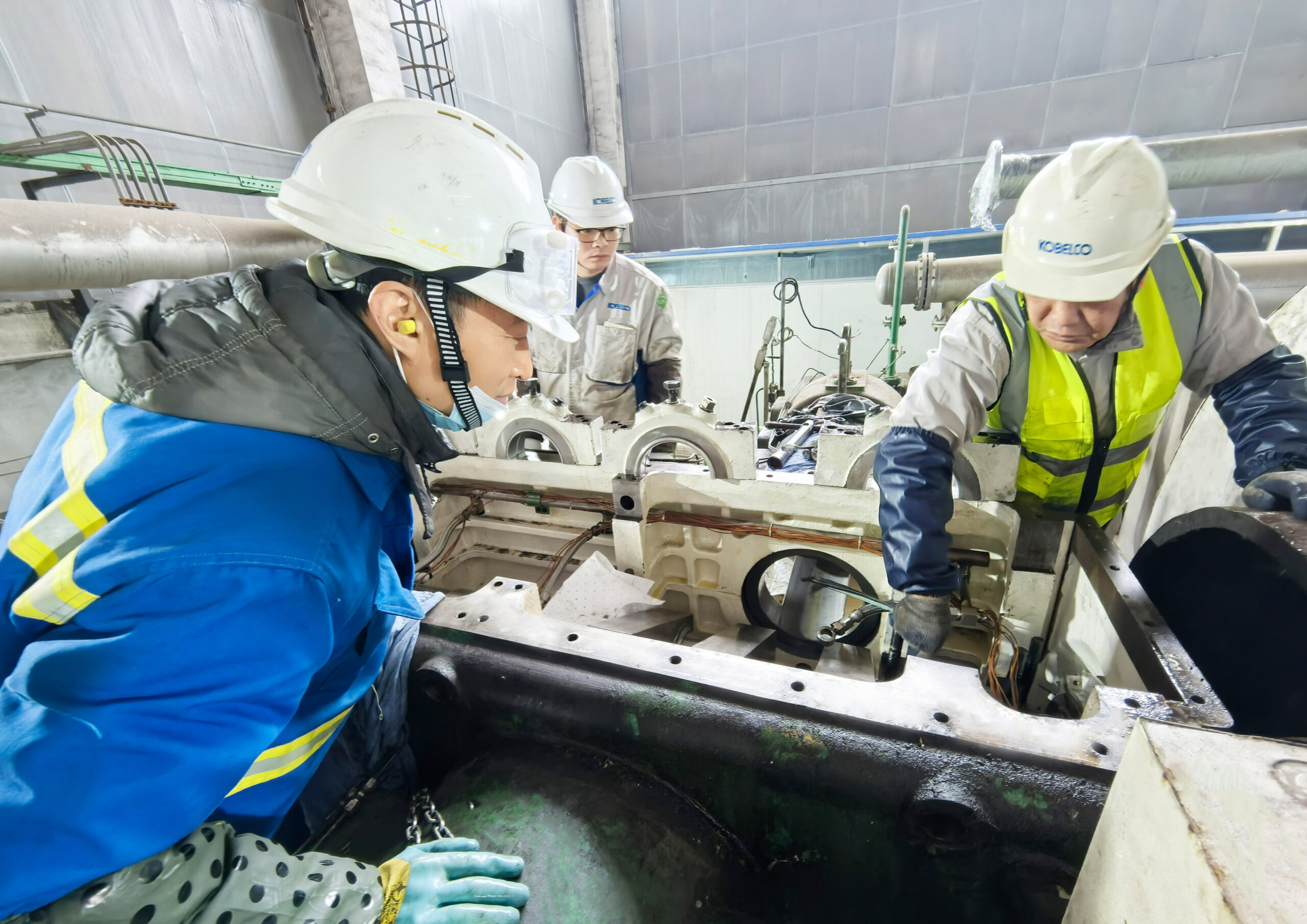 在新疆某大型项目的检修车间内,机器低鸣声持续不断。神钢无锡的服务工程师正手持专业检测仪器,对核心机组进行全方位、系统性的深度“体检”。他们仔细复核每一项检修参数,反复校验运行数据,尤其对关键部位进行重点排查,不放过任何细微隐患。